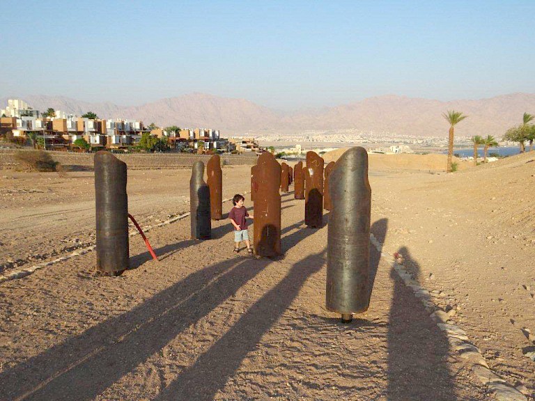 The Way to Mecca was originally conceived as a public artwork by artist Buky Schwartz, and landscape architect Zvi Dekel, in 1999. It has recently been under construction and is close to completion. According to the 1999 proposal, the project was to be sited at Wadi Shahamon (ravine) in Eilat, Israel. Described as a “sculptural / archaeological landscape project,” the work pays respect to Muslim pilgrims journeying to Mecca since at least the 7th century. These pilgrims frequently passed through Wadi Shahamon on their religious travels. 400 meters in length, The Way to Mecca is composed of over one hundred life-size sculptures representing the pilgrims to Mecca. It is a continual reminder that the Jewish and Arabic peoples have coexisted in certain regions for several centuries.