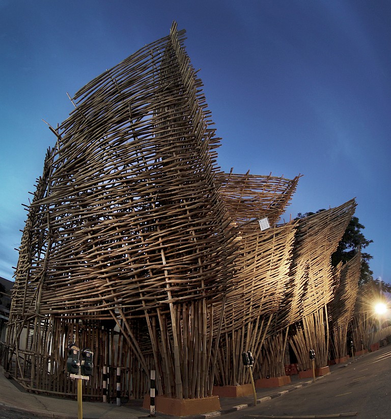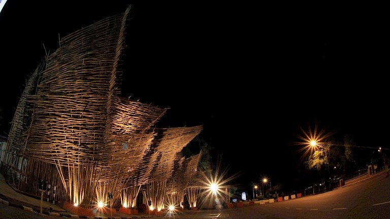 Joko Avianto had the first approach from George Town Festival in March 2012, after they saw his work at ArtJog; an annually contemporary art festival that is held in Yogyakarta, Indonesia. Joko was also presenting a large scale bamboo installation at the façade of Taman Budaya Yogyakarta (Yogyakarta Cultural Park). Later he was invited by the committee to have a site research at Penang. During the invitation trip, he developed some sketches with several sites options that he consider are able to represent his responses idea towards the festival; few of them are market area and an intersection at the old town area. Later he chose not to use those sites for the reason of public permit to block the area to build the artwork. Afterward he decided to choose the Penang City Municipal Council because he saw that site similar to a bridge in between City Hall and Town Hall and also because the historical reason of the site as an old theatre. The artwork was fully funded by George Town Festival, however they also give a fully trust to the artist to develop their work without any idea interference.