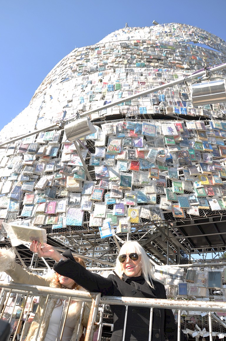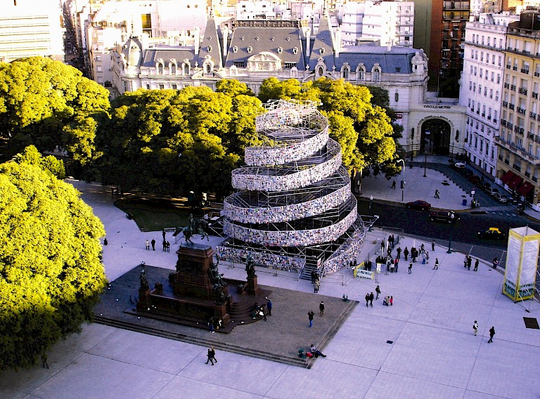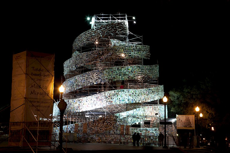 Marta Minujín, an Argentinian artist, is most known for her conceptual, performative, and participatory work, which often deals with political issues in a monumental and radical fashion, incorporating elements of humor and the ridiculous (for example, a Venus de Milo cut from cheese). The notion of destruction is also a prevalent motif in Minujín’s work. For example, The James Joyce Tower in Bread (Dublin, 1980), made of 5,000 loaves, was made to be “destroyed” by the public as they took the bread home with them. This work is important to note in relation to the Torre de Babel, as is the Parthenon of Books (1983), which consisted of a Parthenon-shaped construction of 30,000 books that had been banned by the Argentinian dictatorship during the early 1980s. In each of these pieces, the building materials have three functions: to make up the structure of the work, to comment on a political or cultural situation, and to be utilized and distributed to the public.