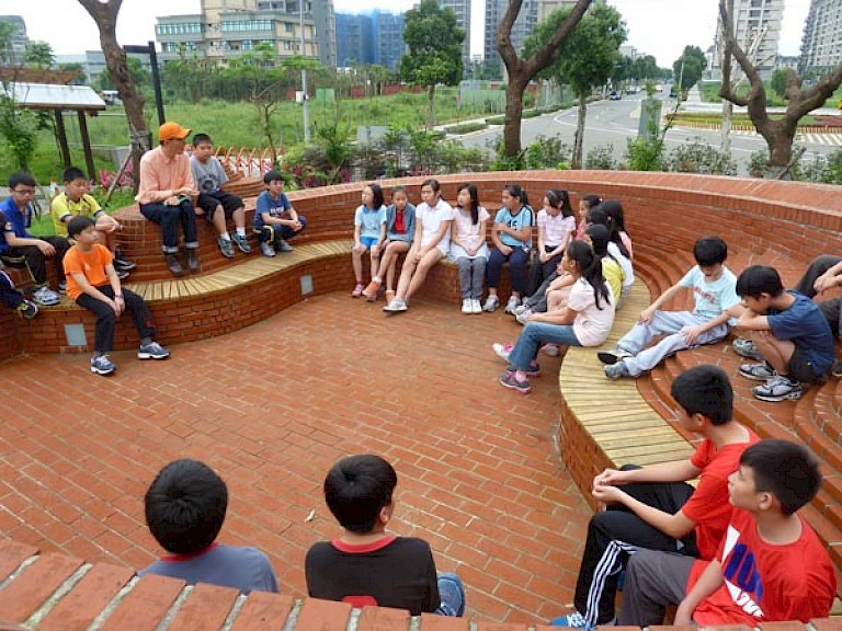 Echoing the history of the land, the Touhu Red Fortress incorporates red bricks in a sculpted terrain, creating a "new land paradise" on the campus, a space where students and teachers can interact, rest, and play. Carved bricks, called "my treasures," were created by the students and their parents and worked into the wall. Each of these bricks tells a story of families who have lived in the area for several generations. A 50-year-old tea tree grows beside this curved and hilly plaza, providing a connection between past and future, a reminder of the stories of past years.
