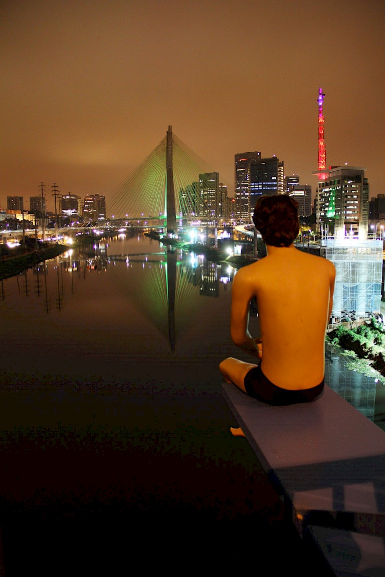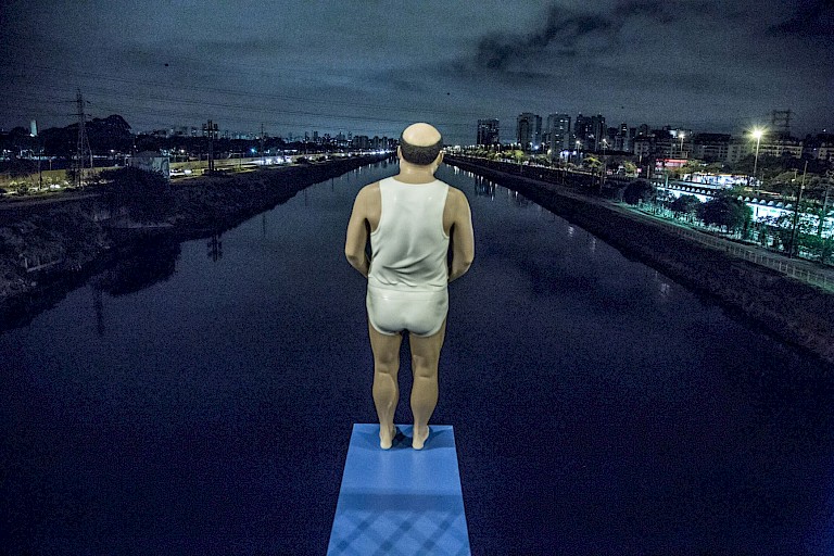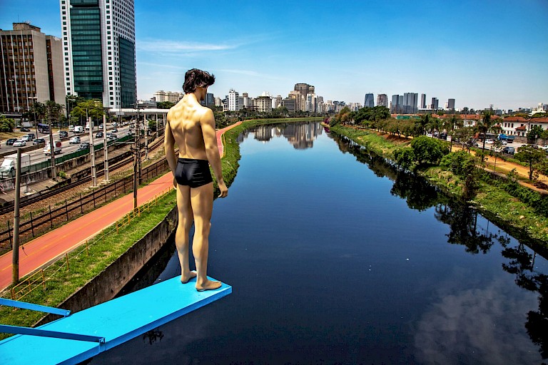 To bring this subject to the Trampolim (“trampoline”) intervention, Srur made realistic sculptures with characters referring to different ages (from children to older characters) in bathing suits, and positioned them on blue boards so that they appeared to be ready and willing to enter the contaminated water - as if it were something possible for them and referring to a time when it was possible to enjoy this river. The objective of the installation is to cause a sense of strangeness, almost like a surreal scene for that place, because it is in the subconscious of the population that the water is improper. This intervention brings this information about the quality of the water to the surface, at the same time that it generates concern when you come across a scene where someone about to throw him or herself in the river.