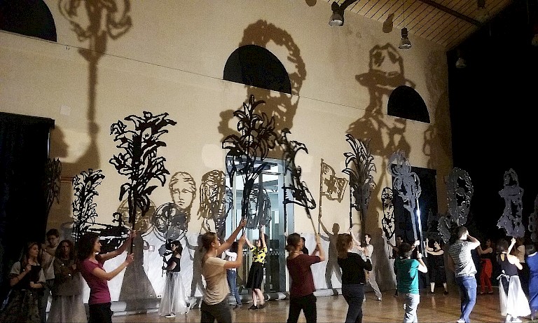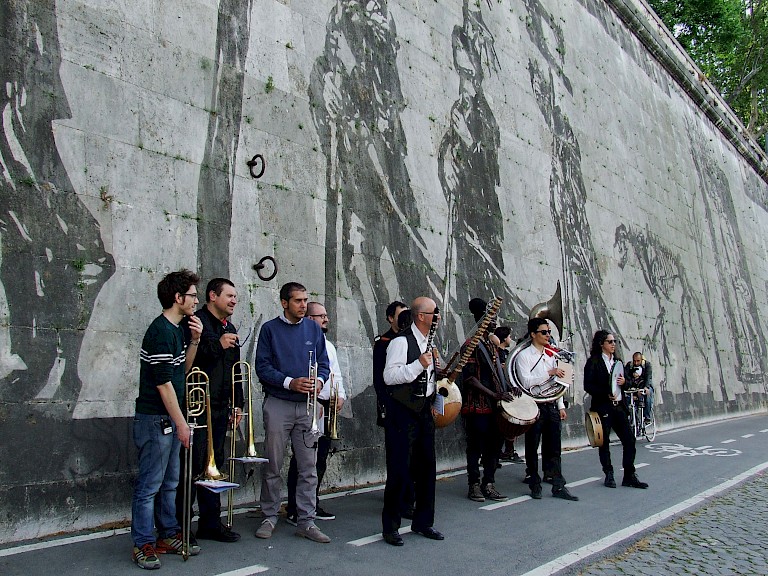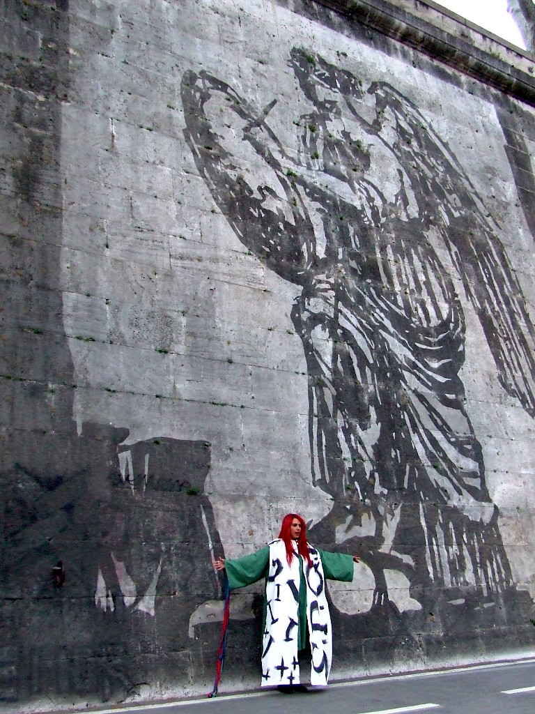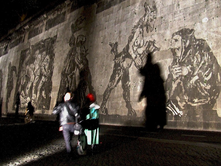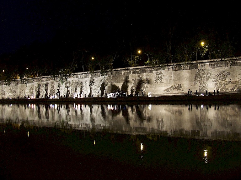 The monumental frieze, Triumphs and Laments, a Project for Rome is William Kentridge’s most ambitious project to date of a monumental 560-meter-long frieze. It depicts a silhouetted procession on Piazza Tevere, through a unique technique: removing years of accumulated bacteria and pollution on the embankment walls, power-washed to reveal more than 50 figures 10 meter high composing a 560 meters long frieze. The frieze, has been realized on the surface of the so-called muraglioni, the high embankment walls on the Tiber River, built at the end of the XIX century to protect the city of Rome from flooding.
