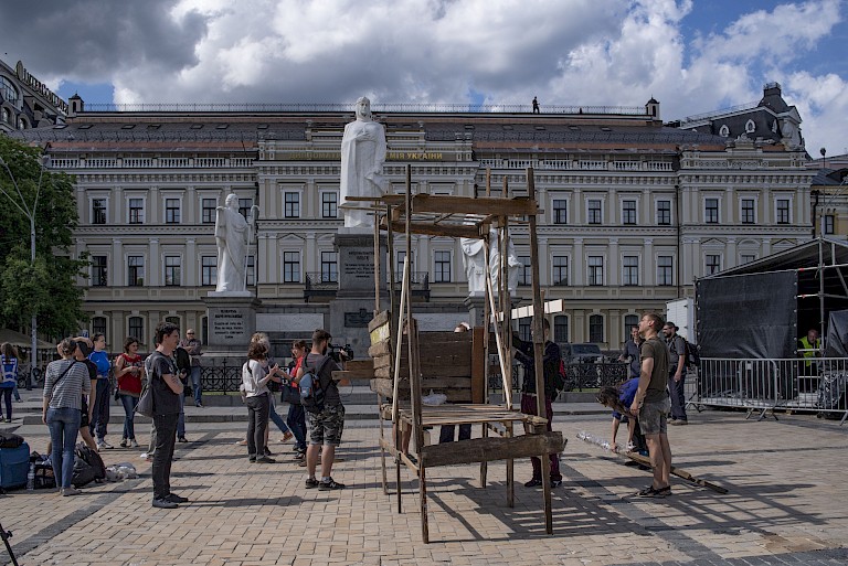 St Michael’s Square is located in between St. Michael's Golden-Domed Monastery, the Ministry for Foreign Affairs, and a luxury hotel. Right next to it is Sofiyivska Square with the ancient Saint Sophia Cathedral. In addition to being an eclectic and lively location, St Michael’s Square was an important place during the Euromaidan protests of 2013–2014, when St. Michael's Monastery opened its doors and hosted protesters escaping from the security forces. Placing a Roma hut-inspired installation there mobilized the complex contexts of this place, reminding that in different circumstances anyone can become a victim of brutality and injustice. As the artists state, “the shanty hut embodies the vulnerability and fragility of communities who arrive and disappear spontaneously. At the same time it can become a disquieting object when set against the logic of the majesty of monumental symbols of power.”