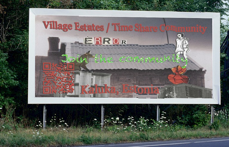 “Village Estates” reveals the possible histories and potential future of Kaluka, an abandoned village in southern Estonia. The artists marked the physical location using QR codes, signs and symbols in order to settle there a collection of photographic, anecdotal, and geographical data. Using the collected data, Errorists created digital representations of possible histories and future potentialities of the site and placed them online. Visitors of the area may access the information by reading QR codes with mobile devices to imagine the site in terms of its potentialities, reflecting on the questionable standards and superficial policies of a market-driven culture. The project playfully structures and reopens the uninhabited rural wilderness by means of omnipresent digital media. It parodies (thus letting one track these down) the sociocultural and economic mechanisms that erase particular spaces and environments from our mindmap only to resell symbolic access to them as a privilege. The artists enhance this understanding by appropriating common neoliberal language, stating that they “build social capital by face to face networking through shared values and common vision”.