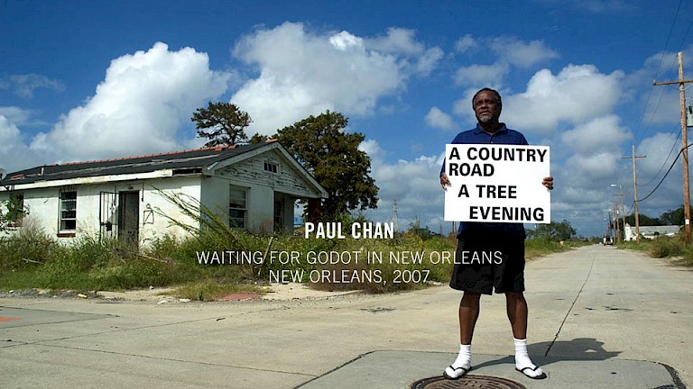 Site-specific performances were staged in two neighborhoods—the middle of an intersection in the Ninth Ward and the front yard of an abandoned house in Gentilly. Each of the four free performances began with a dinner of gumbo and a band to march the audience to the performance site. Chan himself focused primarily on the behind-the-scenes organizing work, partnering closely with The Classical Theatre of Harlem who staged and performed the play. Speaking of the cohesive nature of the project, he emphasized the importance not just of creating a performance to share, but of producing an environment and a public. In this context, the work was performed for individuals whose experiences were reflected in Beckett’s spectacle. They were an invested audience, as Chan described, “a public…incredibly divided, and tired, and waiting, still, for things to come.”