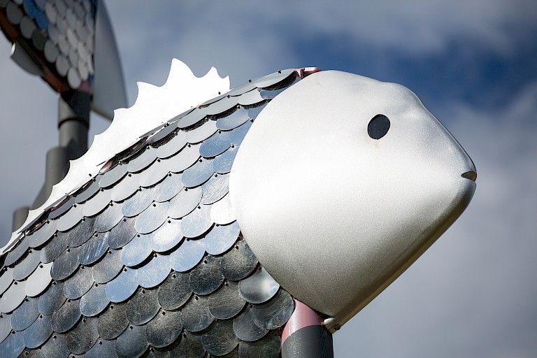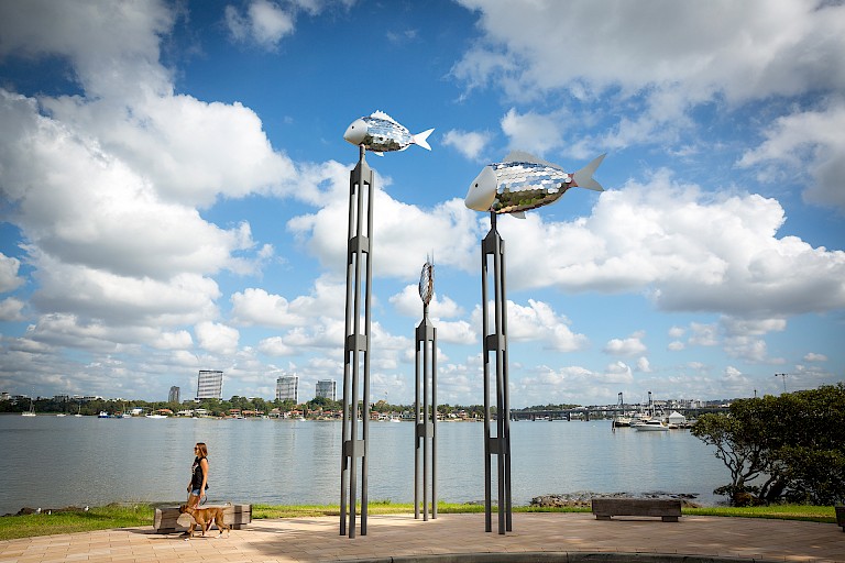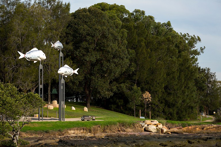 The use of the wallumai is derived from the Wallumedegal clan that inhabited this area. The artists drew from the Aboriginal engravings and drawings that simplify the characteristics of the snapper while still retaining its characteristic skeletal structure. The work represents the traditional totem of the area’s original inhabitants, the Wallumedegal people. It is likely that the clan’s name derives from the word “Wallumai” and “matta,” a word denoting a place. Those living on the southern side of the river, in what is now the Ryde area, were therefore the snapper fish clan. The river and its aquatic life not only sustained the Wallumedegal physically. It was intrinsic to their culture, identity, and way of life, and this is reflected in their adoption of the snapper as their cultural totem. As an artwork, Wallumai Wind Sculpture becomes a symbol of the local identity of Aboriginal people, their fishing practices and the rich marine life migrating and feeding here.
