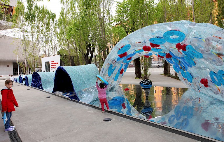 The Wasteland is a trans-medial project born in 2012 with the aim of creating and affirming the a the multidimensional image of the garbage Patch trough the foundation of it State; it consists in series of actions, expressed in a variety of artistic forms, which constitutes the iconography of the phenomenon. The Garbage Patch State has been in made its appearances in many occasions; manifesting itself trough clues in many cities of the world trough events, installations, workshops, and international conferences realized with the large support of important institutions such as UNESCO and UN, with the contribution of students from different universities such as Università La Sapienza, Università di Palermo, Università Roma 3, University Ca’Foscari, IED Madrid, and other associations. Art installations treating of this very contemporary emergency have been exhibited in various cities of the world: in Paris, in the central pavilion of UNESCO (2013) and again at the World Climate Conference (2015); in Venice, at the Art Biennale (2013 and 2014); in Madrid (2014); in Rome, at the Museum of Twenty-First Century Art (Maxxi) (2014); in New York, at the UN Headquarters (2014); and in Milan, at the Universal Exposition (Expo) of 2015, in Island of Mozia (Sicily, 2016) and in Rome 2018. A large amount of people, institutions, association and organizations have taken part to the project, always showing great interest and concern to the cause by financing, recycling the plastic cups to make the artwork, by assembling the artworks, or some of them just asking for a passport to become citizen or sharing the events on social media.