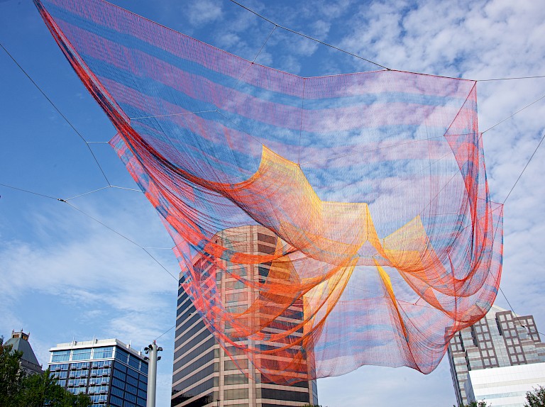Where We Met embodies many contradictions: volume and porousness, advanced technologies and handmade craft, permanence and ephemerality. In these characteristics, it builds upon painstaking processes that Echelman and her collaborators have honed over the past two decades and is imbued with themes that have developed throughout her body of work. Her sculpture directs the eye to in-between spaces and connecting points. It has a deep relationship with place and yet is open enough for visitors to create their own meanings. The project gently calls attention to a larger relationship with the natural world while contributing a dynamic presence of its own to shared public space.
