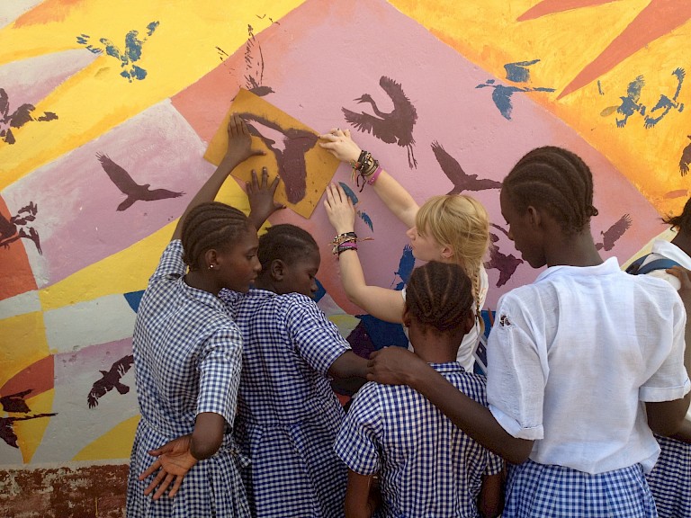 An important part of WOW has been the series of art workshops that artists conducted for local children. Since art is not taught in schools in rural Gambia, workshops resulted in new artistic skills for the children and immersive engagement with the local community for visiting artists. Significantly, several murals were created by the school children in collaboration with the artists. From 2011, WOW began to incorporate an annual school exchange with the United Kingdom, so that children from the United Kingdom were linked with children from the Gambia, and traveled to the villages to paint murals on schools with their local counterparts.