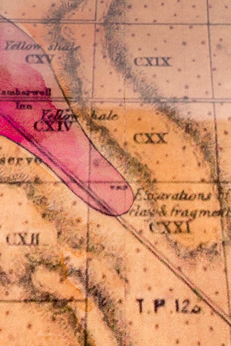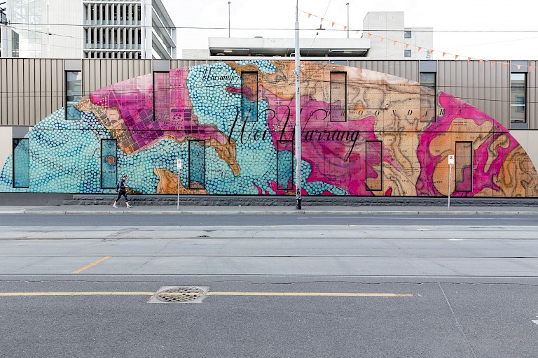 Overlaying maps from the early colonial period are Aboriginal place names in the local WoiWurang language, allowing the traditional but now buried ways of calling and describing land to resurface. Cope’s facade invites people to situate and see themselves in the historical space, reflecting the continual change of urban, social, and cultural environments. The particular maps in this art work are geological maps, representing the distribution of different types of rock and geological deposits, as well as locations of structures such as faults and folds in the land. Such maps are crucial for land-use planning - a key point, as for Cope, an Aboriginal woman, “connecting language to resources connects Aboriginal people to these resources.”