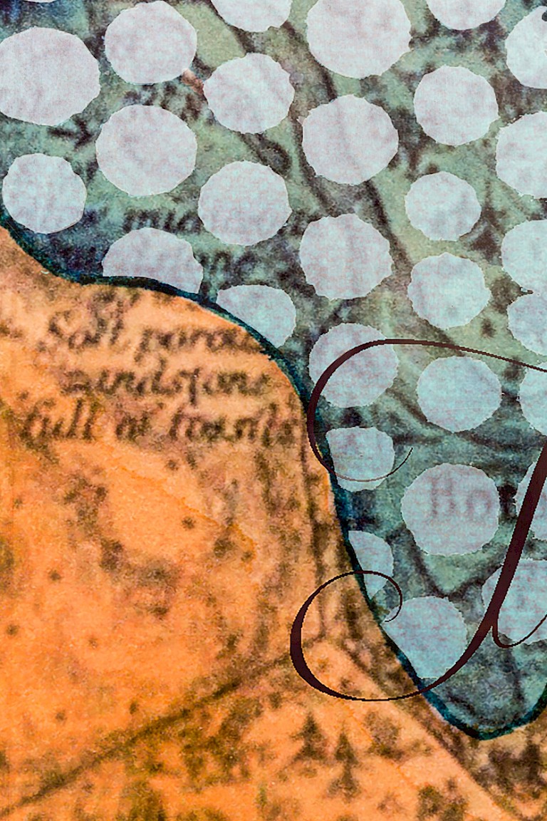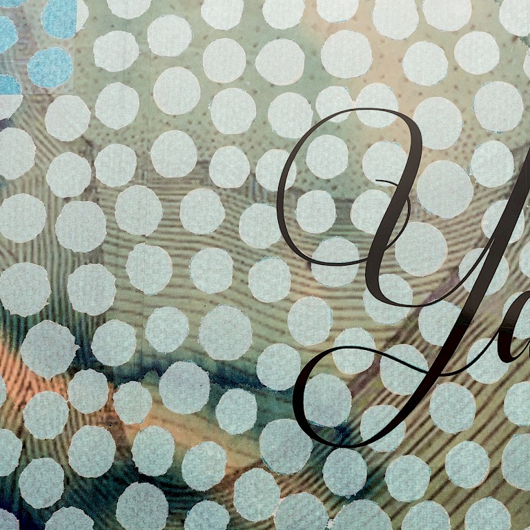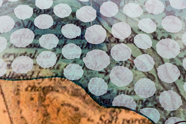 Blue washes of colour form one layer of You Are, Here Now and refer to rising sea levels. Metallic dots echo the characteristic form of Aboriginal dot painting, which the artist sees as “overlaying my country/Quandamooka/my being as a saltwater woman and how we see the world from [her ancestral land]…pretty much just beautiful blue ocean.” Asked about the political and philosophical motivations for the methodologies applied to the work Cope explains that applying these layers attempts “to challenge the viewer’s sense of time and ownership of place over familiar places. Using colonial tools such as maps illustrates western ways of seeing and relating to place and also creates a sense of familiarity. For my people, and many other Aboriginal peoples, our concepts of time and place obviously supersedes colonisation and we have memory and stories connected to the last sea level rise which was c. 6,000 years ago.”