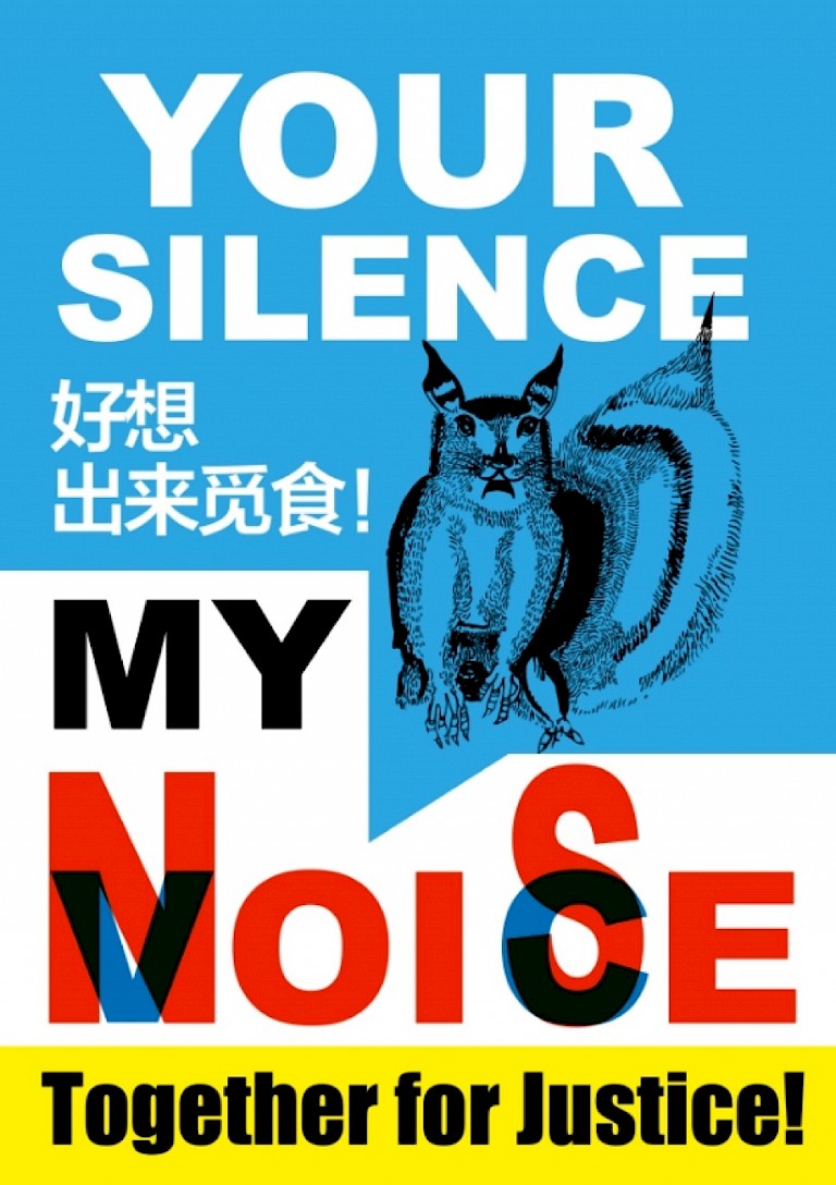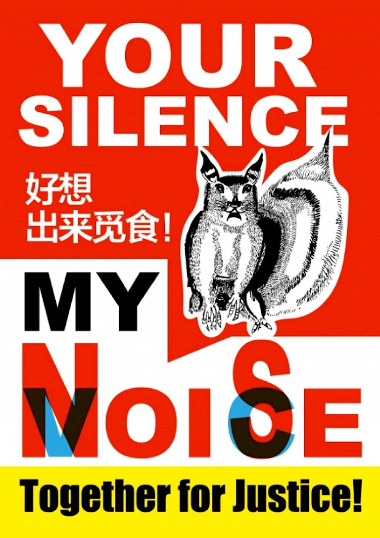 In light of these considerations, Huang Pei began her interviews with neighbors of various identities and backgrounds, including taxi drivers, mechanics, and office workers. She categorized their attitudes into four distinct types: ""supportive and empathetic,"" ""completely indifferent,"" ""struggling with inner conflicts,"" and ""prone to emotional outbursts."" Furthermore, she conducted her research around the strike location, capturing ambient sounds from different distances and areas. Upon completing the field research, she connected with her three Chinese partners, Pan Yufei, Yue Min, and Lu Jiadong, and discussed with them the details of the squirrel disappearance, the the strike and the interview process, which led to in-depth discussions. Yue Min, an autistic artist in Nanjing, opened up about her experience of living with bipolar disorder, relying on medication to manage her anxiety. She keenly felt the discomfort brought by the sounds of the strike and expressed empathy and concern for the workers, squirrels, and individuals around the strike site who also suffer from mental disorders. Pan Yuefei shared her experience of racial discrimination and strikes during her studies in the UK. She said, “I could imagine how vulnerable squirrels would feel facing with the voices of human protests.” Their mutual sharing and emotions motivated them to become advocates for the disappearing squirrels and marginalized communities. When creating the poster, Yue Min contributed by drawing a squirrel with an anxious expression, while Pan Yuefei added her own touch by imagining how the squirrel’s voice would sound in Chinese ""好想出来觅食!"" (I don’t want to hide, I want to forage for food!). Huang Pei crafted the final slogan ""Your Voice, My Noise, Together for Justice!"" portraying the conflicting experiences of both the strikers and squirrels at the intersection of injustices, all of whom are vulnerables struggling to survive. Ultimately illustrator Lu Jiadong utilized a bold red or blue backdrop, filling the entire canvas with anxious squirrels and slogan with dual interpretations, creating a visually captivating and tension-evoking effect.