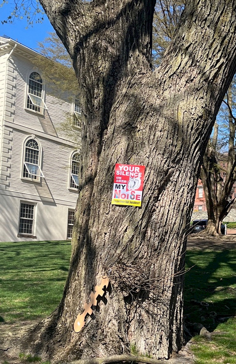 "On April 16, 2023, a collaborative activist/strike poster titled ""Your Silence, My Voice/Noise Together for Justice - 好想出来觅食! (I don't want to hide, I want to forage for food!)"" provided distinct observation and insights into the entrenched “political correctness” within Western strike culture. The poster was created in response to a strike that took place at Rhode Island School of Design (RISD) in the United States. From April 14 onwards, more than 600 students and staff members alongside members of Teamsters Local 251 and custodians, groundskeepers, and movers, embarked on a two-week strike to protest the school administration’s silence toward wage increases, despite having access to a $660 million dollar endowment. Together, they raised their voice in chants, covered the wall with posters, and set up large-scale art installations, The art students played musical instruments, banged on metal sheets, and urged people to honk their car horns, expressing frustration and anger through diverse “sounds” that they could imagine.