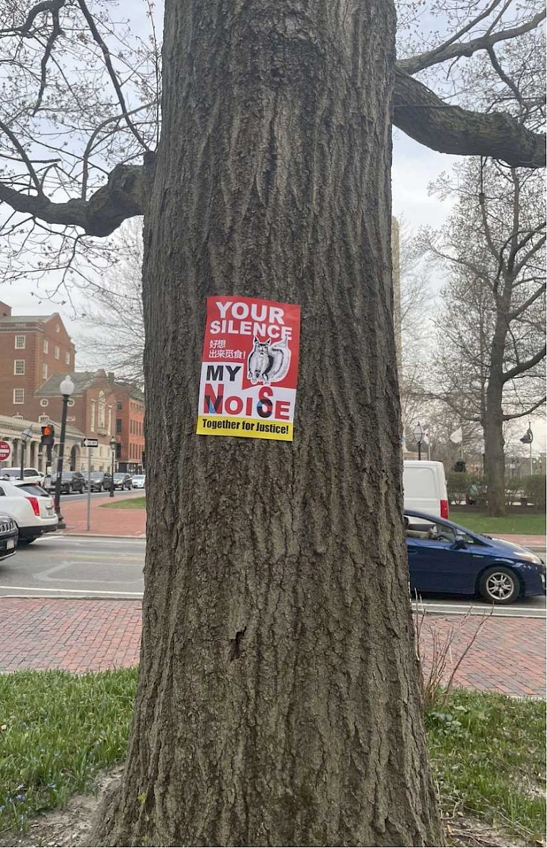 However, unlike other posters in activist/strike art, Your Slience, My Voice/Noise Together for Justice--好想出来觅食! wasn't displayed at the campus entrance, nor did any participating students hold it up during the marches. Instead, the art group chose to attach these posters on the big trees along the picket lines of the school where squirrels habitat. Normally, the green areas along this street were frequented by wildlife like squirrels and birds, but during the protests, their presence disappeared amidst the noisy demonstrations. Huang Pei, the curator and a Chinese international student, observed a “poster” written in Chinese profanity, placed prominently among the numerous posters showing support for the strike. Encountering this poster posed an emotional challenge for her. This wasn't solely due to her belief in the importance of maintaining a certain level of personal conduct but also the persistent noise from the protests worsened her pre-existing anxiety-induced insomnia. The sleeplessness had become a significant obstacle in her hard-won academic journey. Additionally, it sparked her curiosity about the authentic feelings of the local community residents regarding the strike. Meanwhile, she deeply empathized with the yearning of American workers for labor rights, and recognized the unfortunate reality that the voices and rights of racial identities and non-human others are frequently disregarded and exploited within the neoliberal environment, let alone being drowned in the localized wave of strikes. Political activism become an outlet of releasing pent-up dissatisfactions and expressing demands, incorporating heterogeneous and aggressive language to grab attention and stimulate discussions.