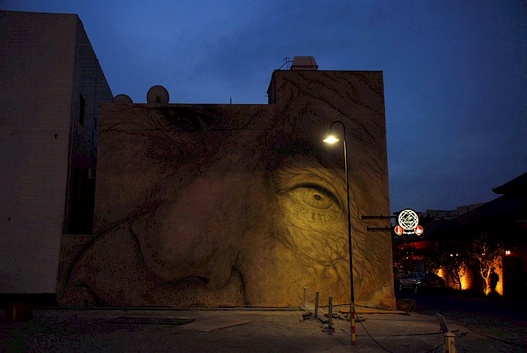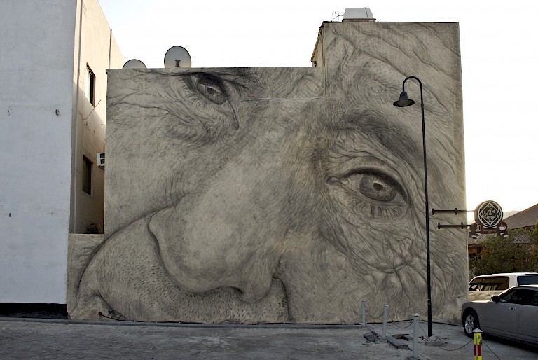 Another commendable aspect of the project, and indeed, of the artist’s street art practice, is the use of materials that do not impact negatively on the environment. Thus, all the Identity works, including Yousif, fade and ultimately disappear over time, as a result of degradation/erosion by wind and water. This aspect of the work may be contrasted to graffiti executed in typical spray paints, which are not only toxic, but also relatively permanent. In terms of placemaking, Yousif made a part of Manama’s public sphere more habitable, at least on an existential level, by depriving the site of political and commercial imagery and associated interpellative forces, providing in their stead the face of an unknown man, an ‘everyman,’ staring as it were, from Bahrain’s receding past. In this way, Yousif also provoked questions about the position of everyday people in Bahrain’s future.