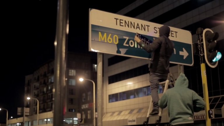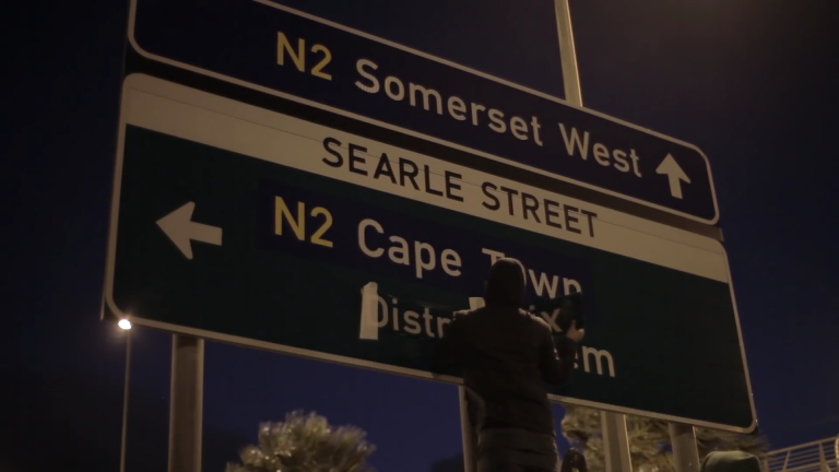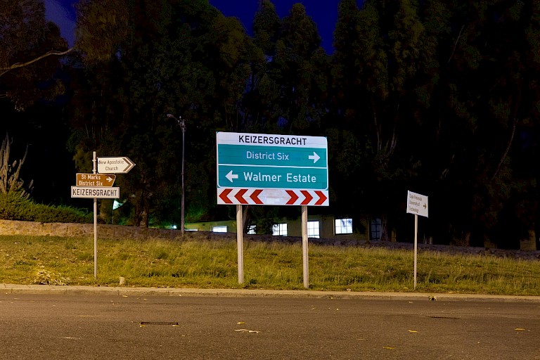 This project is an innovative collaborative public art intervention that quietly but effectively reclaims the historical name of “District Six” from apartheid-era officialdom, which renamed the area Zonnebloem as part of an apartheid-era erasure of the people of colour who lived and worked there until their forcible eviction. District Six, an area where people of different races lived together in a working-class neighbourhood, fell foul of the racist Group Areas Act that reserved economic centralities for whites and the economic peripheries for the black population. Thus the area experienced brutal forced evictions about 50 years ago. This effacement still stands today in post-apartheid South Africa, with empty land haunting the city amid contesting claims around how to best redress its brutal past. The act of changing the signboards to indicate their original name is is thus a politically charged act of reclamation and supported by original residents of the area in a broader project of the artist's called Witness. Generally people do not notice the change - unless they are new to the area and are perplexed by the difference between the signs and GPS mapping devices. The signboards thus do not attract much attention but those in the know mostly appreciate the gesture as a piece of conceptual graffiti art and political activism.